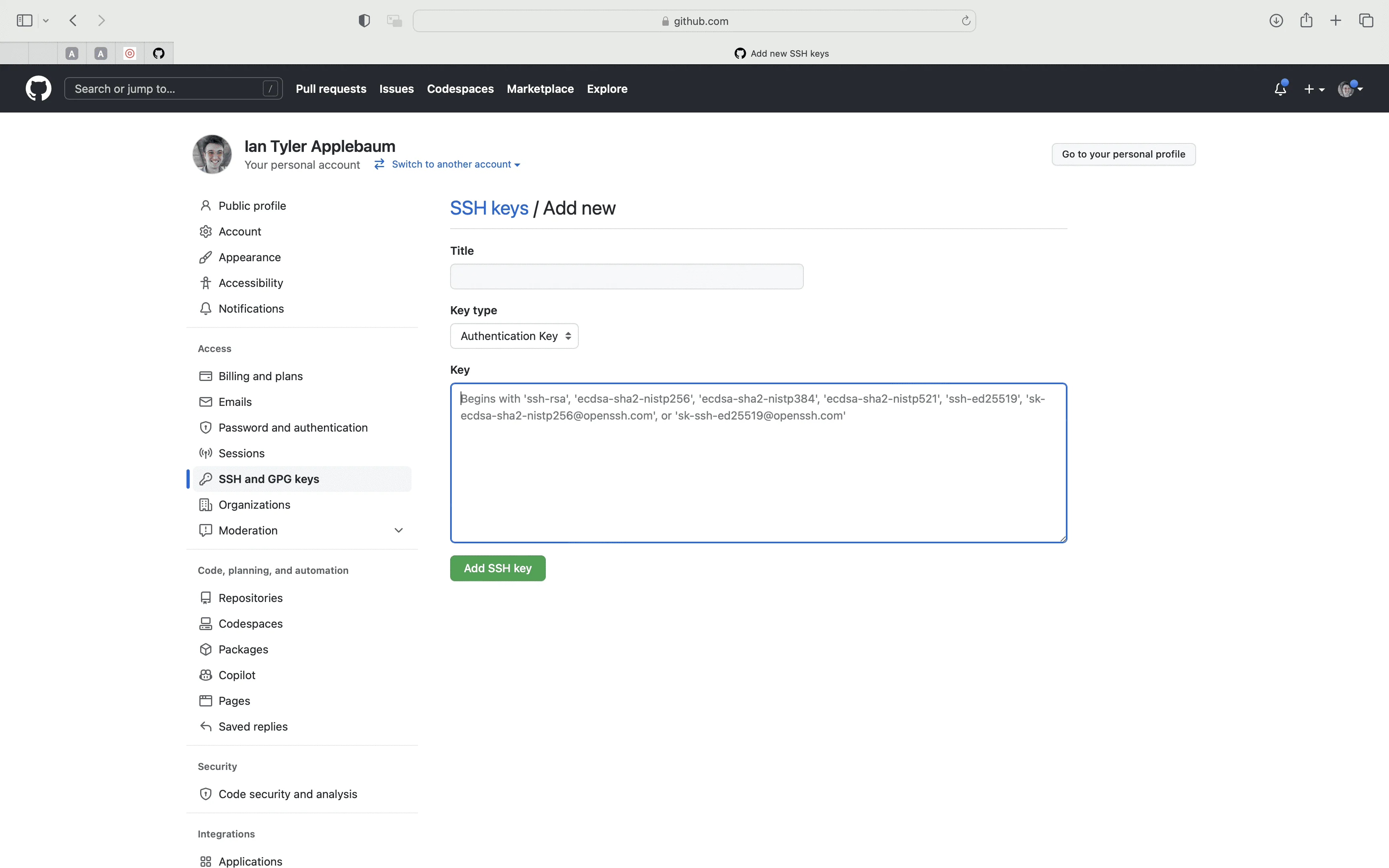 With your public key copied to your clipboard login to https://github.com Tap on your profile in the top right corner as seen in Figure 1.1 and click Settings. You will then navigate to the SSH and GPG Keys menu on the Settings page. click "New SSH Key" and paste your public key that should be on your clipboard.