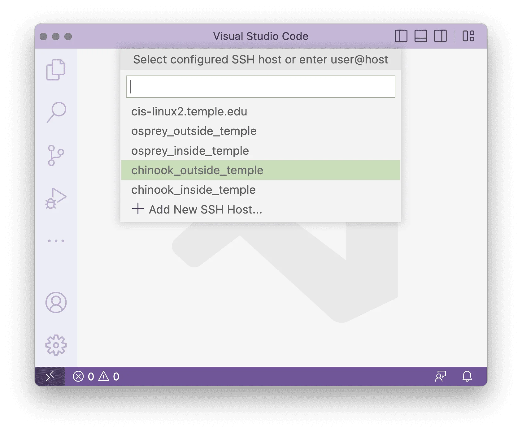 .ssh/configfile with all of Temple's servers that we wish to tunnel through. - Create an ssh key and add it to each server so that we don't need to type in a password everytime we change code.